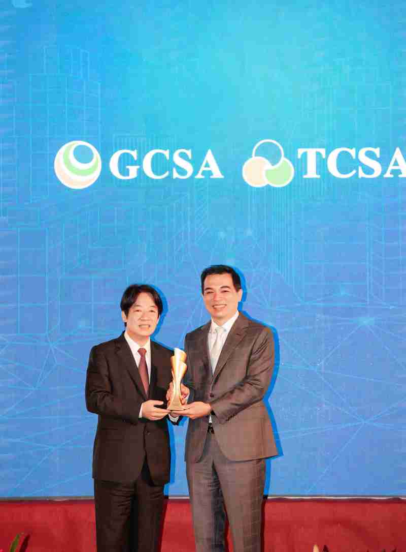 达全方位永续表现获全球永续奖及台湾永续奖肯定,,,由副总统赖清德颁奖 (左),,PG国际总经理柯富仁 (右) 代表领奖
