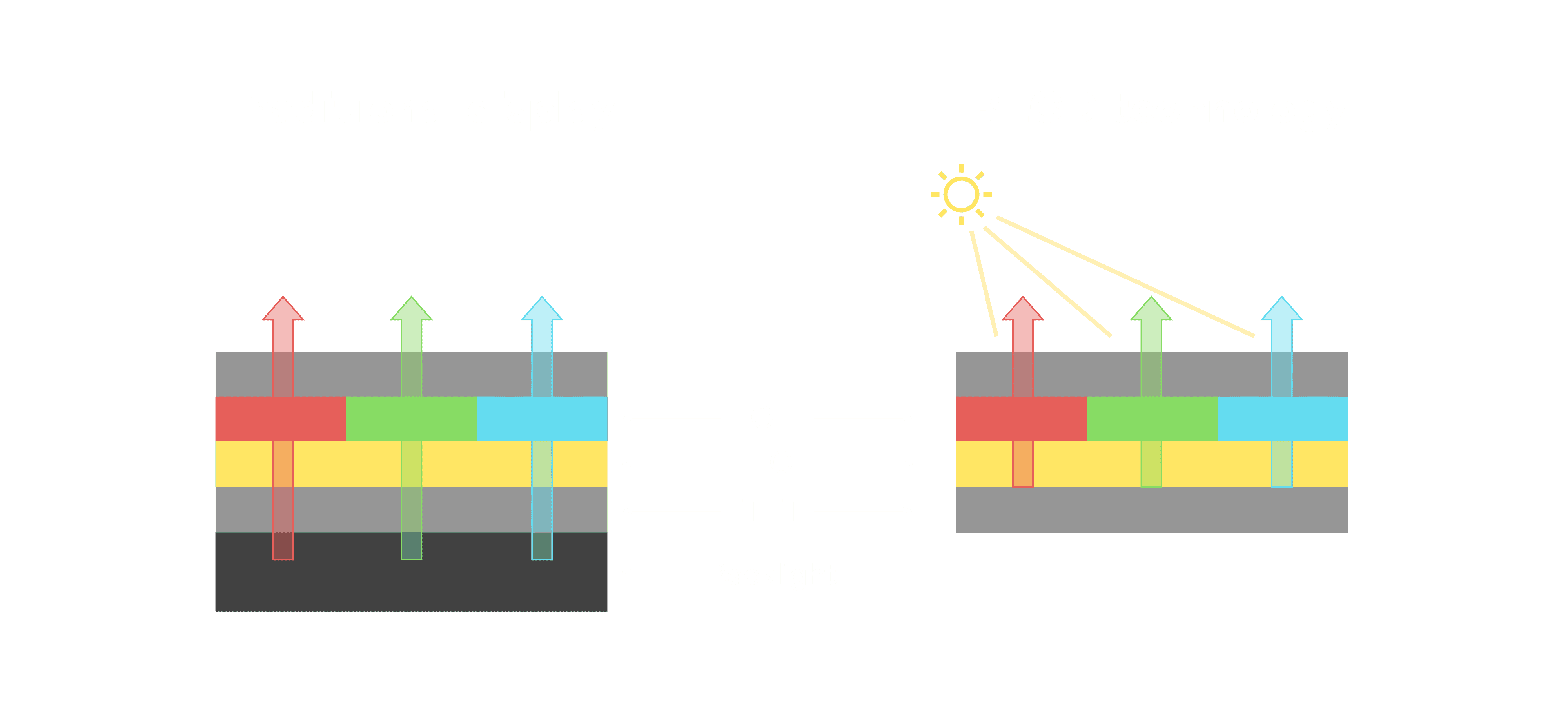 与传统需搭配背光单元的液晶显示相比,,,反射式液晶技术不仅更省电、、、、更轻薄,,且即便在艳阳下仍能清晰显示。。此外,,,,少了背光单元,,也大幅降低了 LED 蓝光伤害眼睛的疑虑。。。。