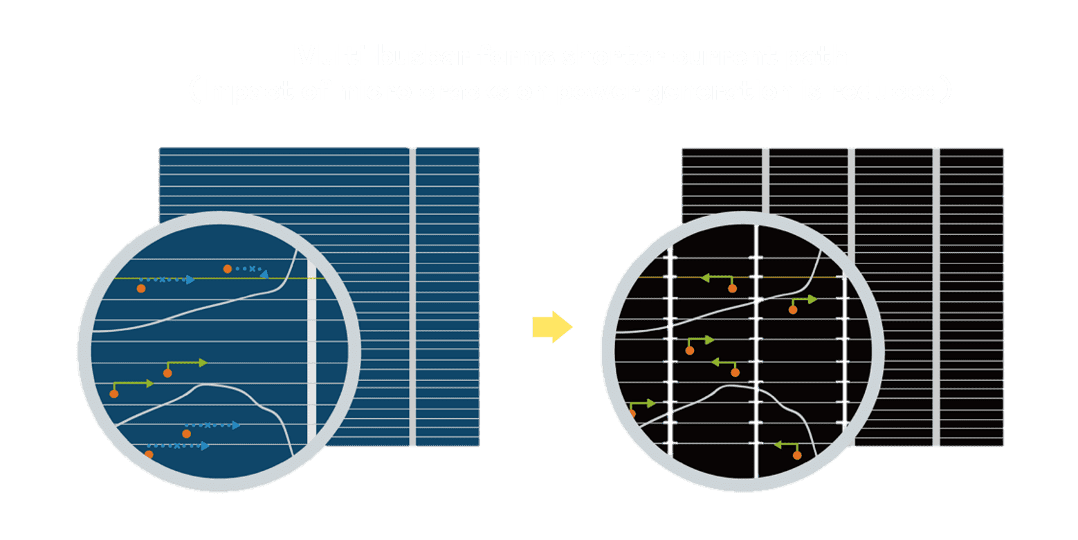 - 电池使用多条铜导线 (Copper wire) 于电池片上形成较短的电流路径,,,提高电流收集效率,,采用圆形设计的铜导线较传统扁平式的铜焊带 (Ribbon),,可增加入射至电池的光线量。。